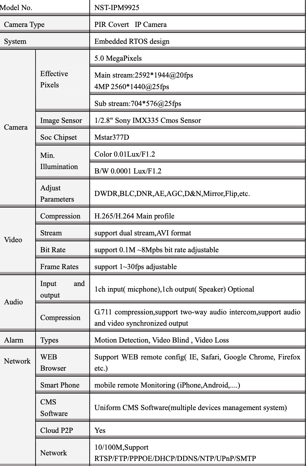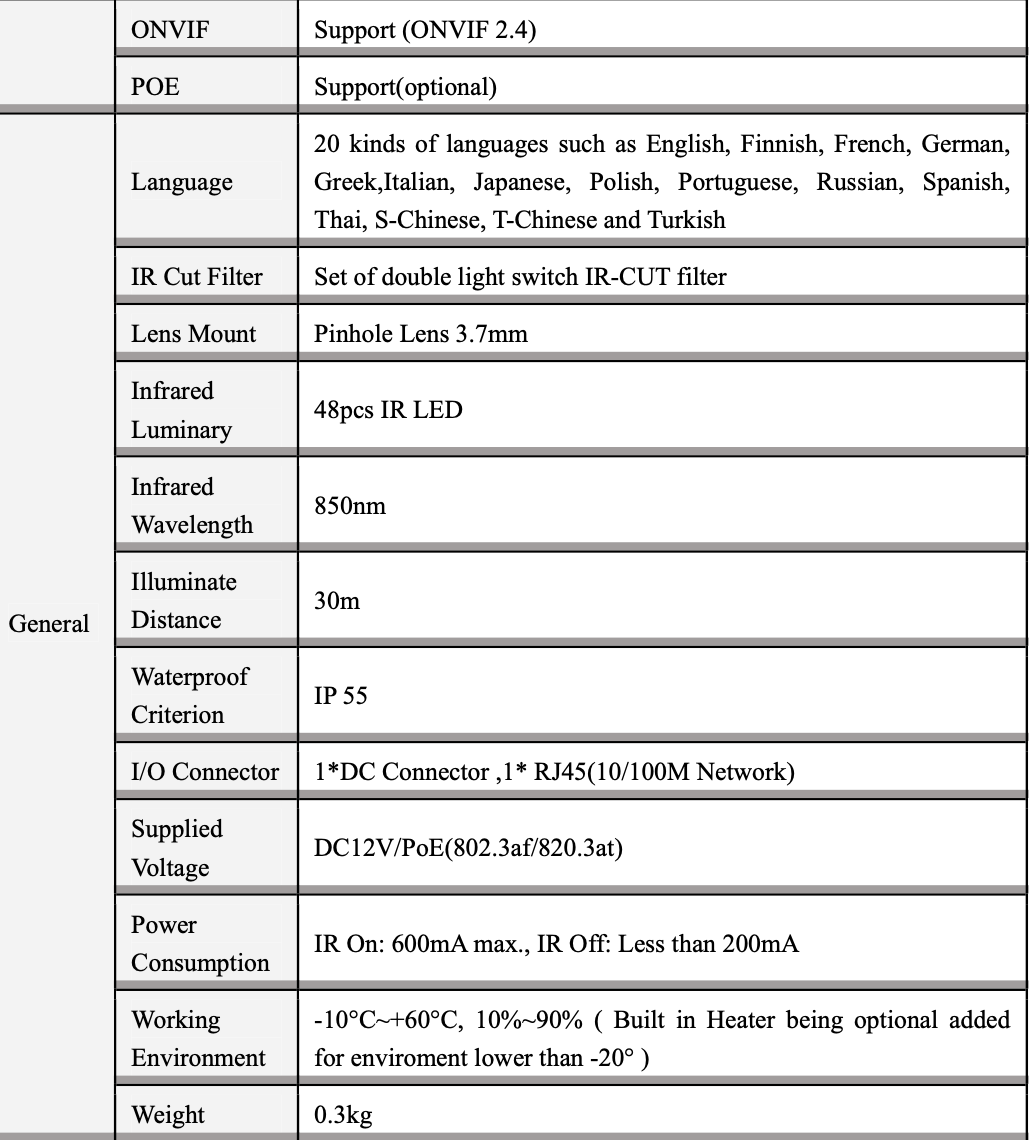 Effective Pixel: 5.0 MegaPixels/Main stream:2592*1944@20fps/4MP 2560*1440@25fps/Sub stream:704*576@25fp
